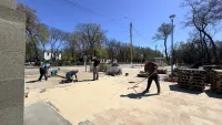 Уже завершается укладка плитки на участке вдоль памятника, продолжается монтаж садовых бордюров. Строители активно ведут благоустройство и на противоположной стороне за остановкой.