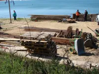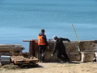 На первом ярусе, у моря, строители ведут работы вдоль подпорной стены, где раньше были навесы.
