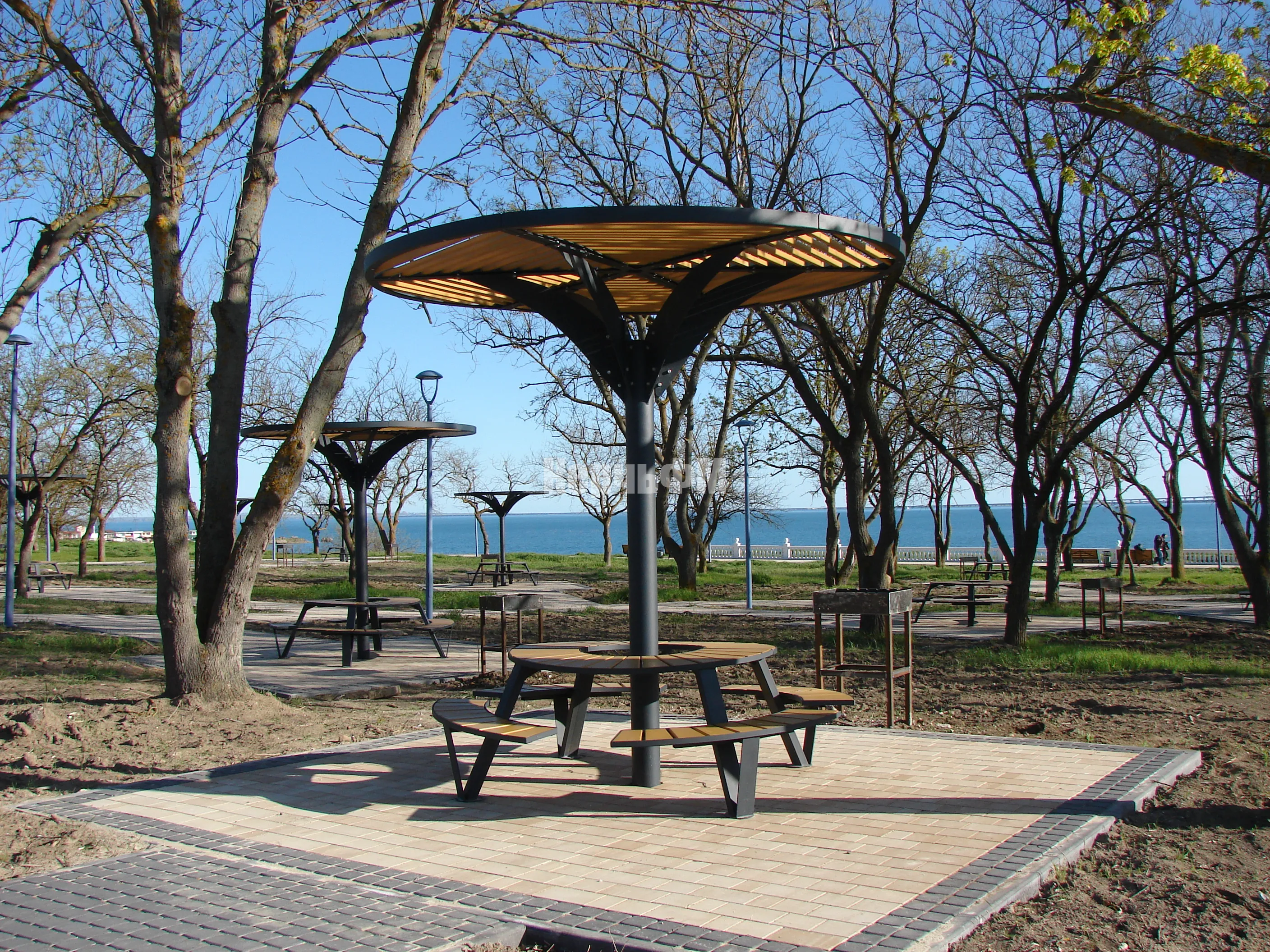 Слева от центральной аллеи Приморского парка, возле столиков с теневыми навесами, установили 11 мангалов.