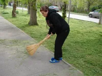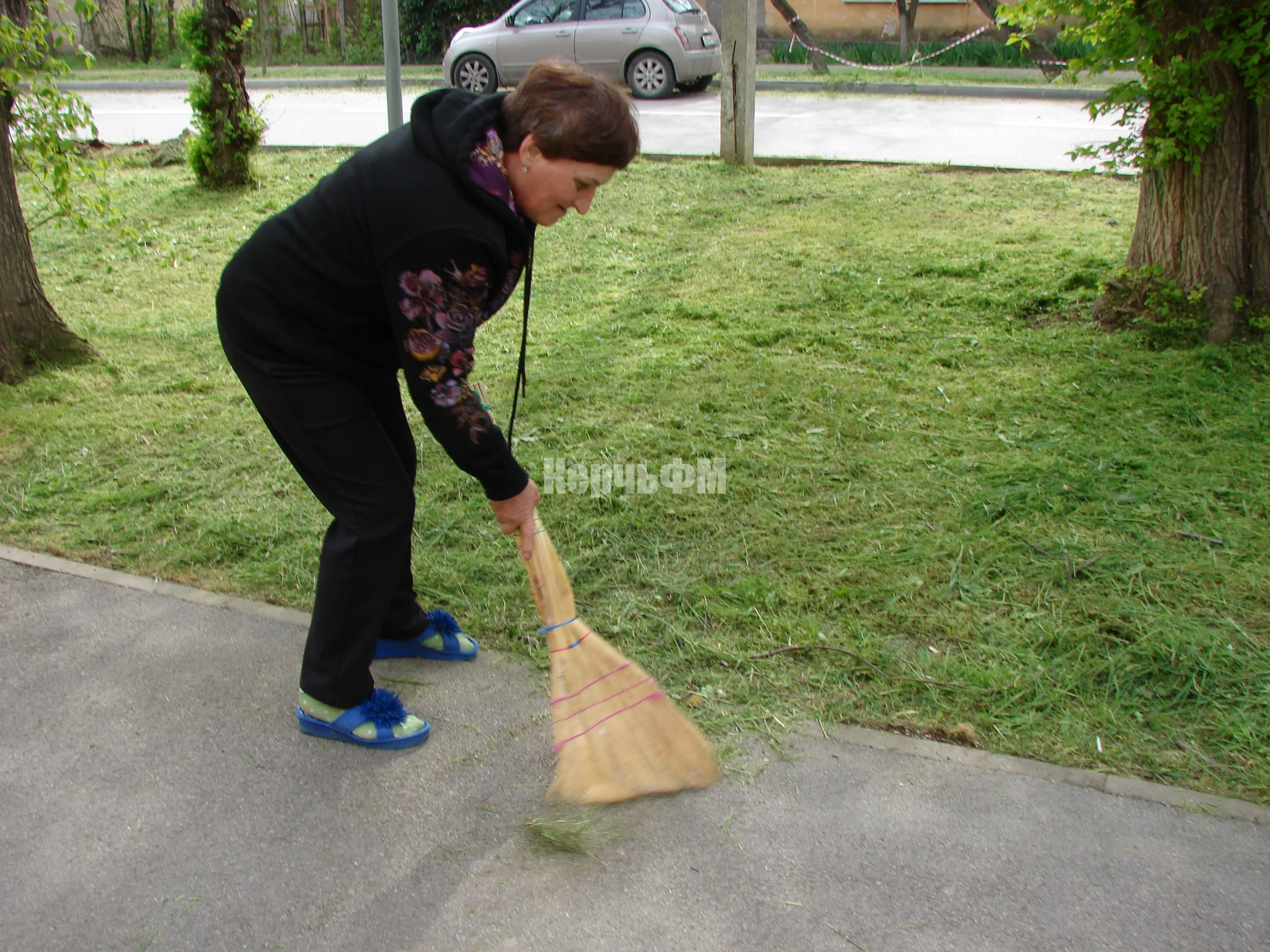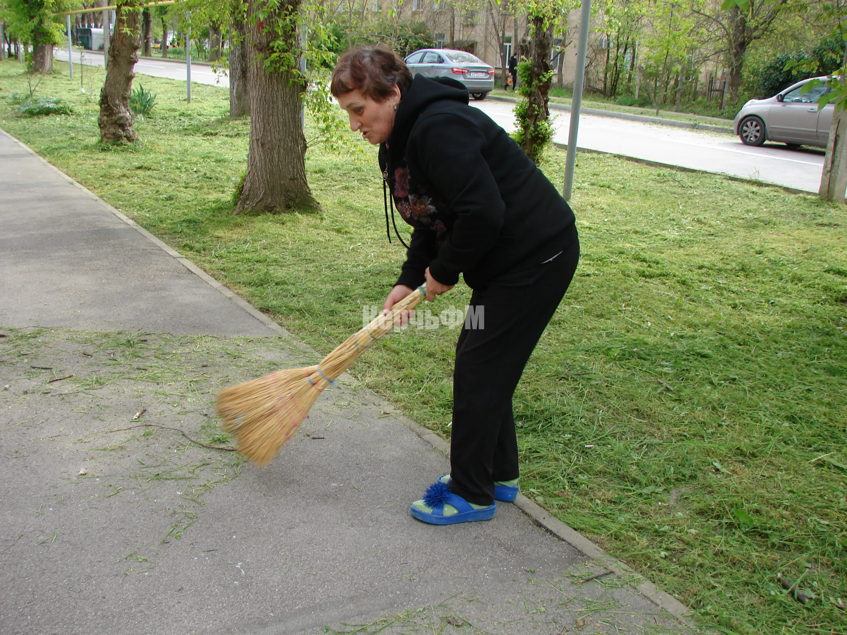А застали мы ее с веником. Она подметала тротуар у дома после работы косарей.
