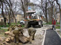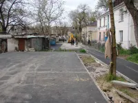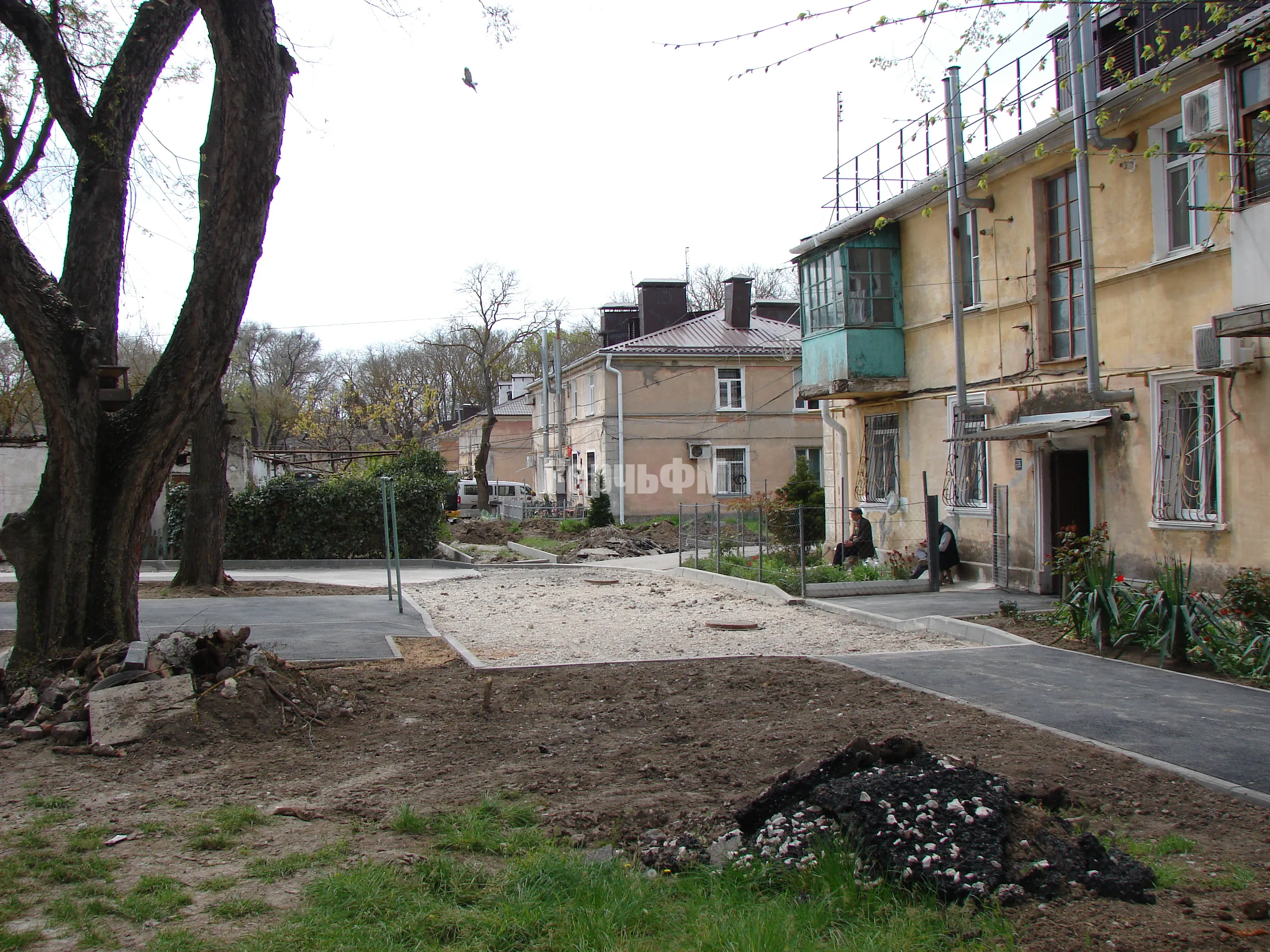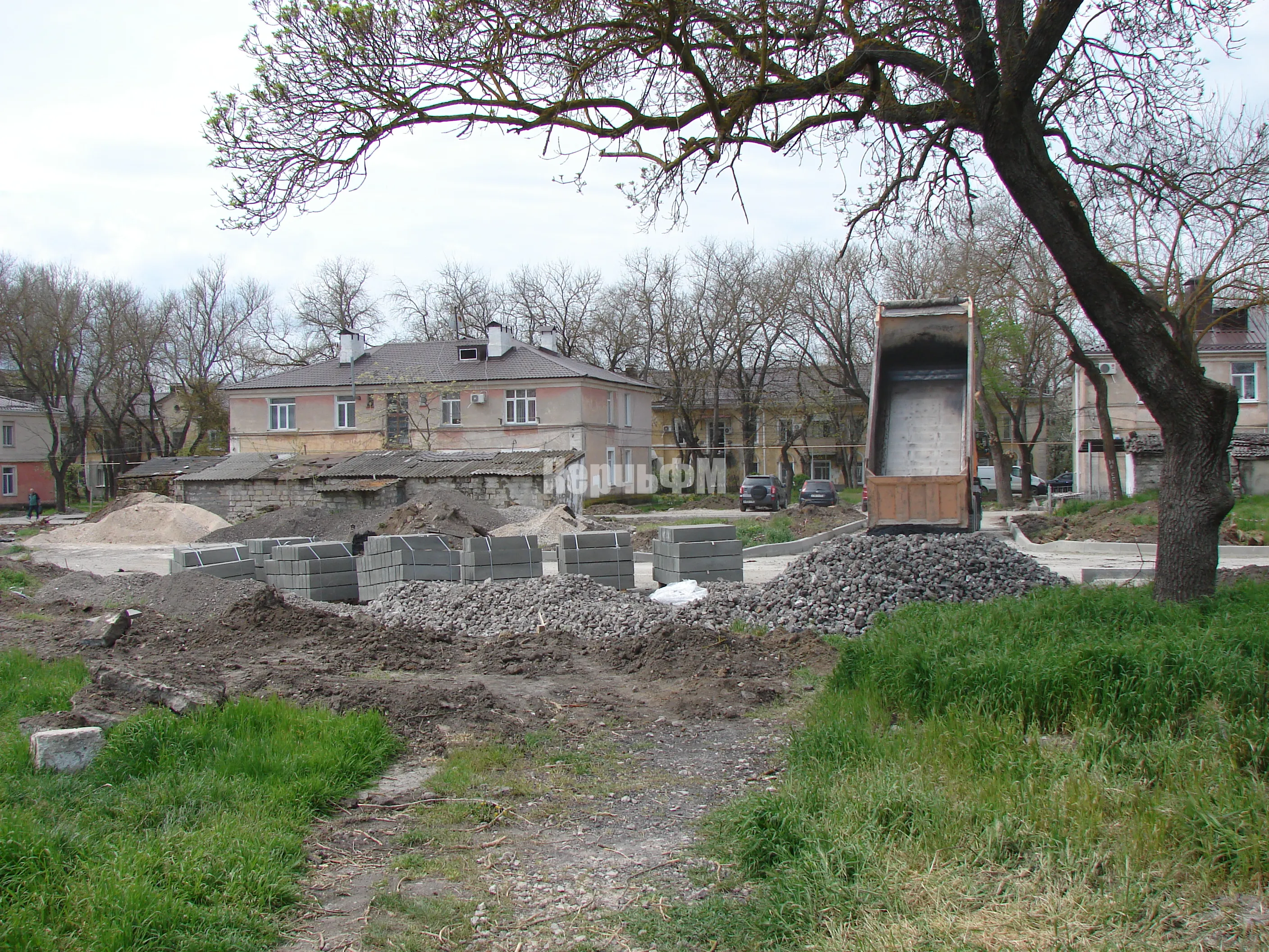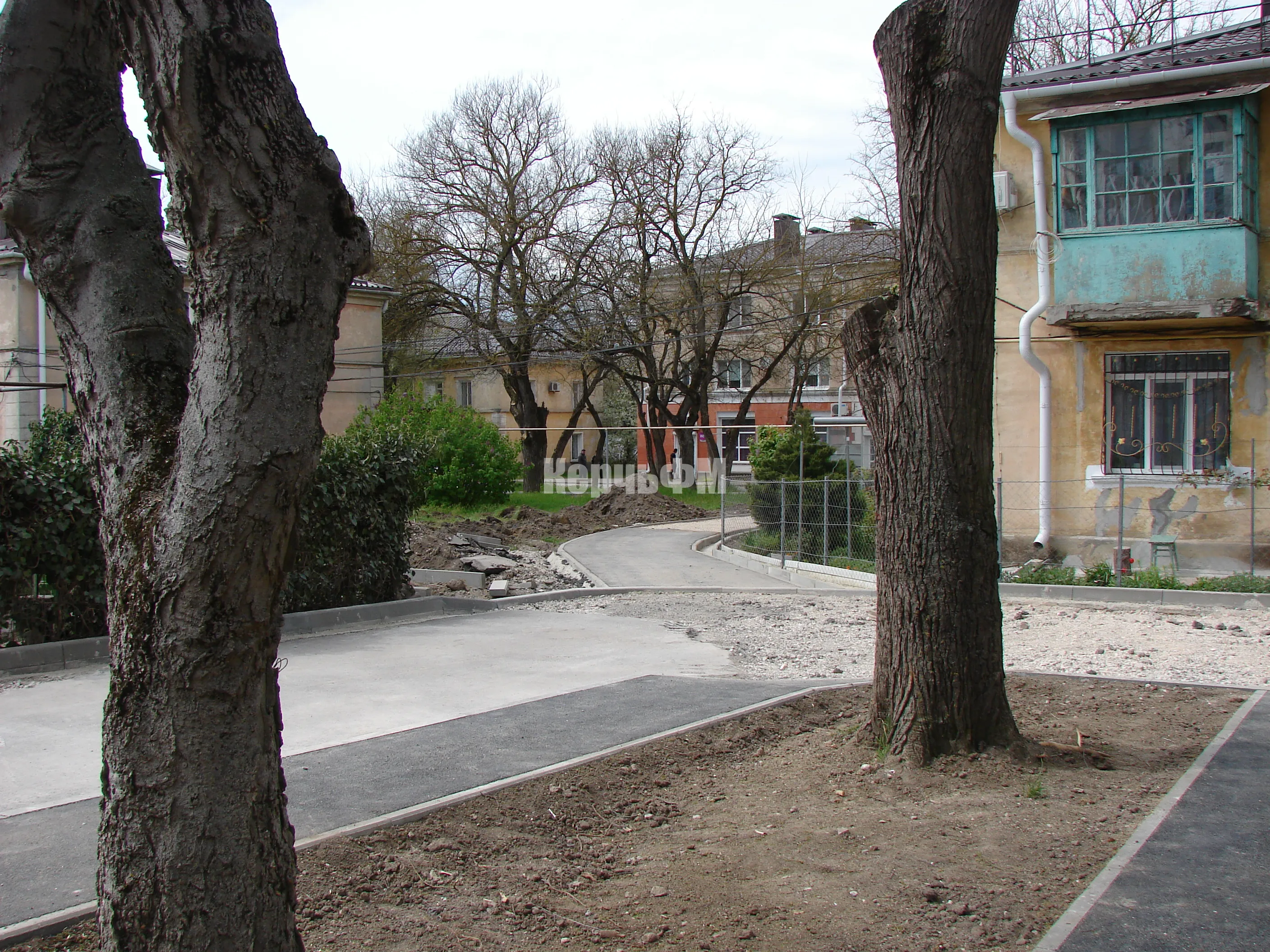 В квартале благоустройства по Спартака, 4,6,8,10 в Керчи пилят деревья и укладывают асфальт
