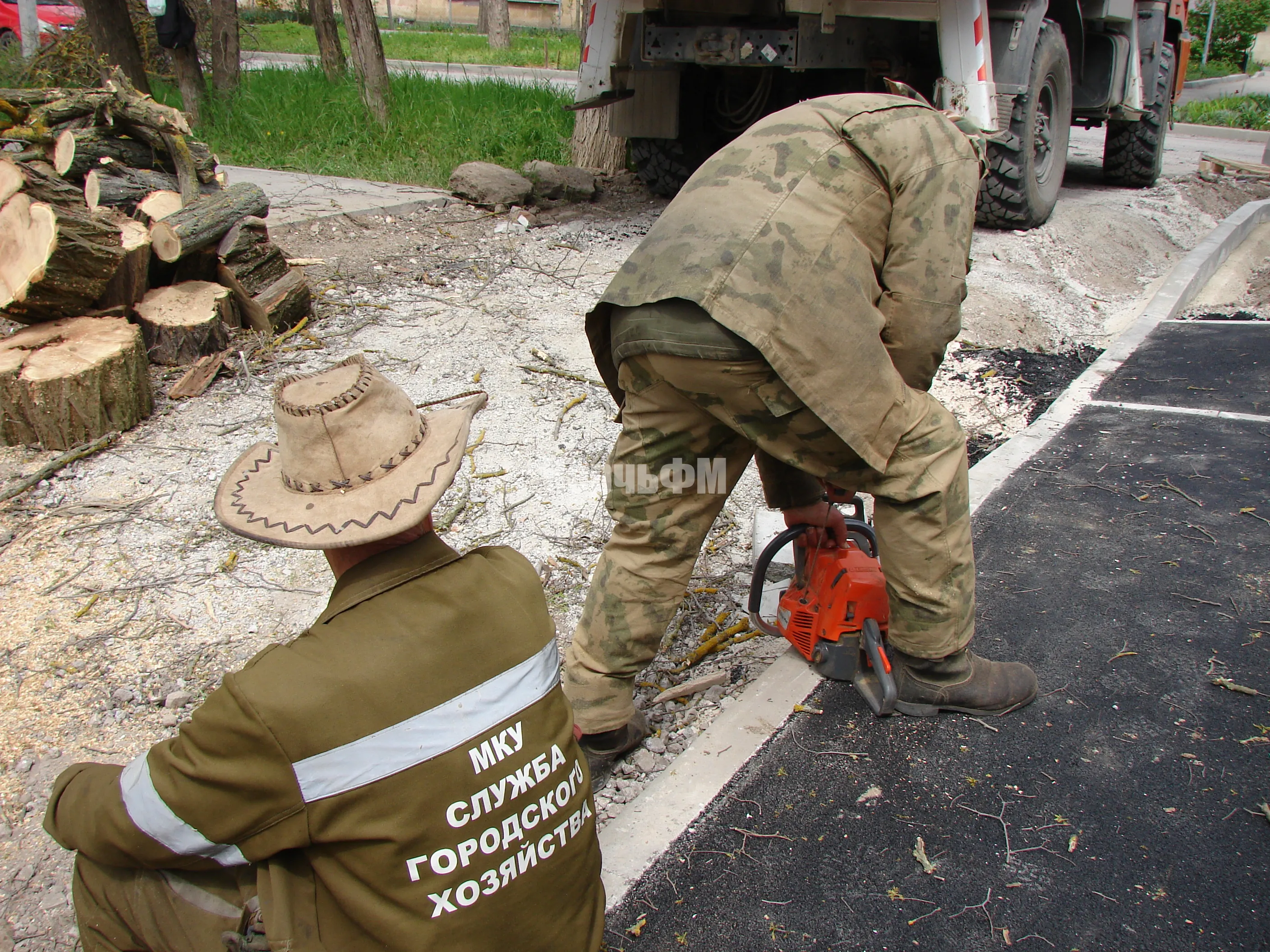 Специалисты-высотники Службы городского хозяйства продолжают спил аварийных веток высоких деревьев.
