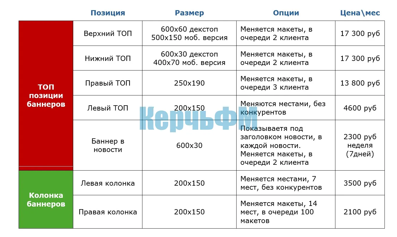 Перечень рекламных мест, которые вы можете арендовать на сайте Керчь.ФМ