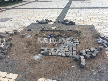 Рабочие раздолбили плитку и с помощью крана увезли столб. К обеду на месте флагштока осталась лишь разрытая яма с проводами и плиткой.